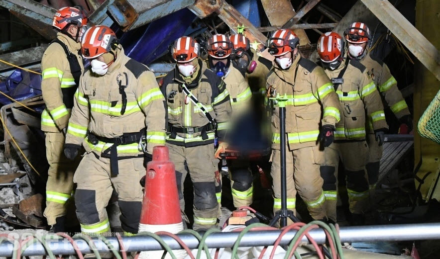 소방청(청장 직무대리 김승룡 차장)은 11월12일 오전 6시12분 울산화력발전소 붕괴 사고 현장에서 매몰자를 추가 수습했다고 밝혔다. 매몰자를 구조대원들이 들것을 이용해 붕괴된 건물 밖으로 나왔고 병원으로 이송하기에 앞서 소방대원들이 거수경례와 묵념을 하고 있다. 세이프투데이 윤성규 기자(sky@safetoday.kr)